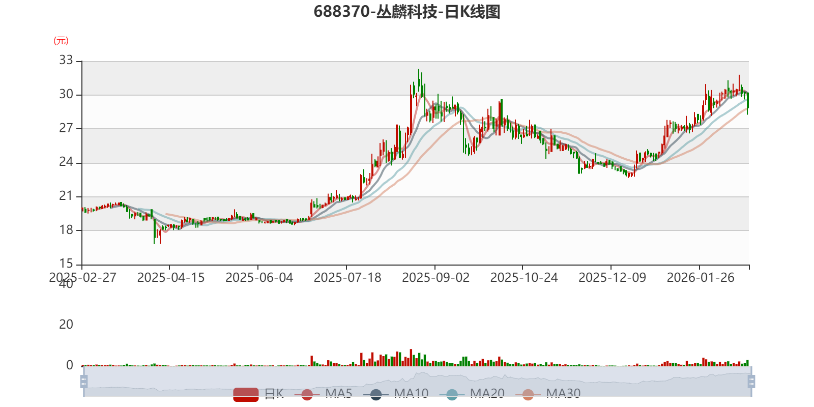 中证智能财讯丛麟科技(688370)2月26日晚间披露2025年业绩快报,公司实现营业收入5.26亿元,同比下降11.59%;归母净利润2395.57万元,同比下降73.39%;扣非净利润亏损845.29万元,上年同期盈利5423.07万元;基本每股收益0.17元,加权平均净资产收益率为0.9%。以2月26日收盘价计算,丛麟科技目前市盈率(TTM)约为165.23倍,市净率(LF)约1.5倍,市销率(TTM)约7.08倍。